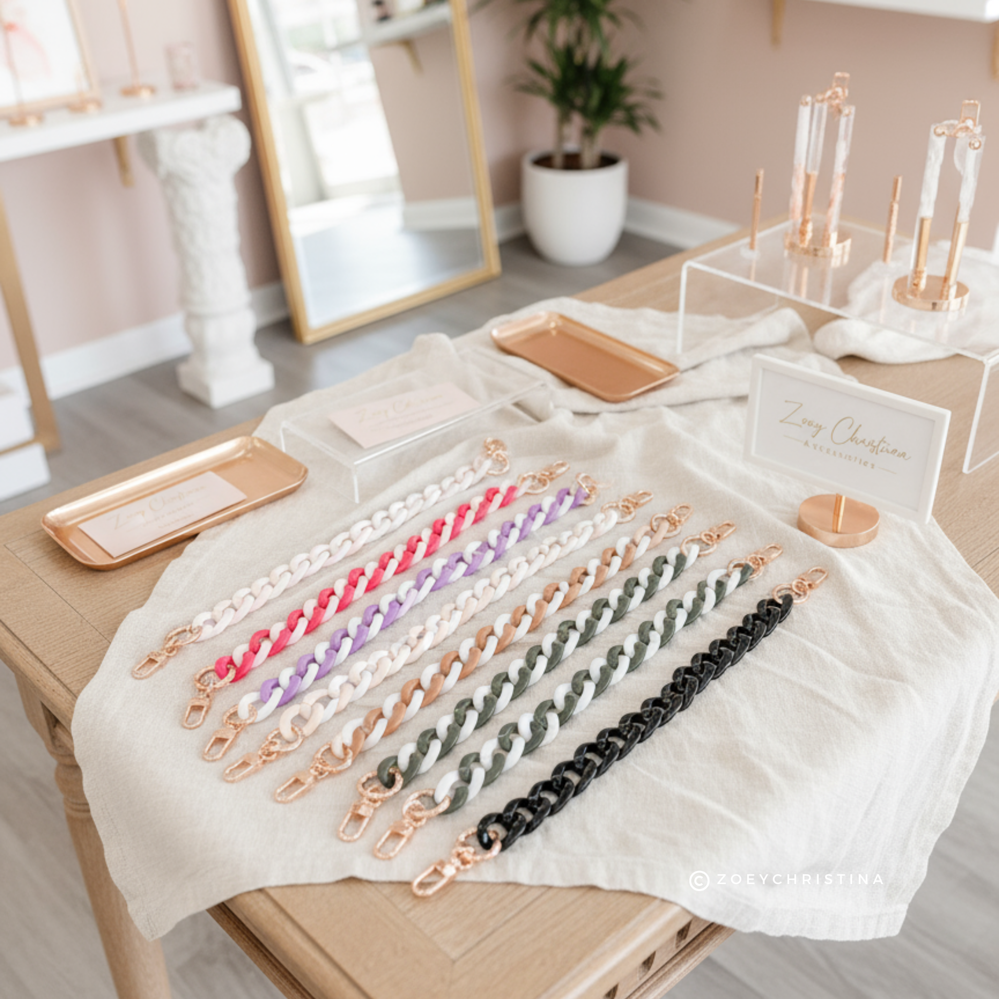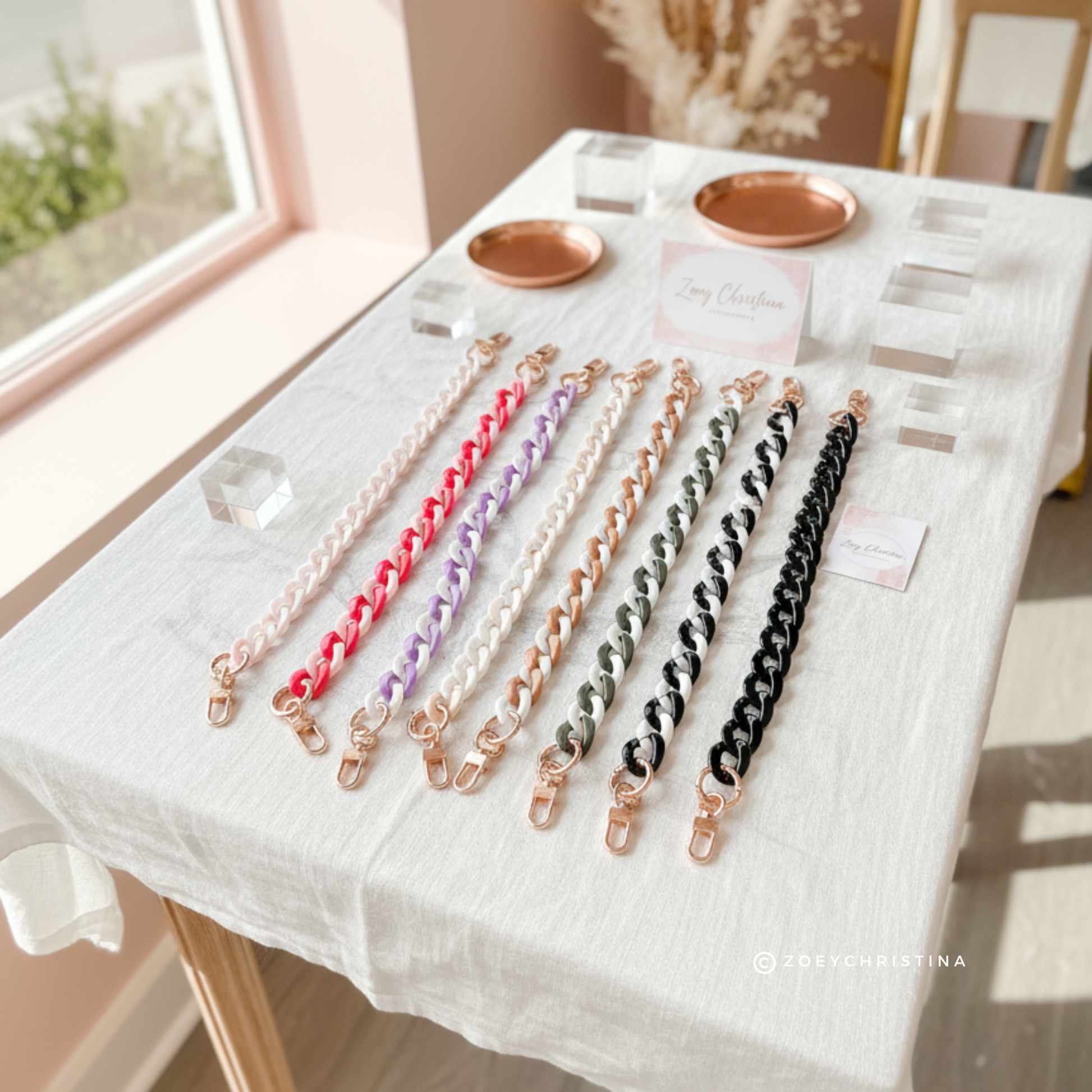 Add a bold pop of color and texture with our 16.5" Chunky Acrylic Bag Chains. Available in 8 stunning color combos, each chain features gold hardware and a trendy, oversized link design—perfect as a statement accessory, purse handle replacement, or decorative charm for handbags, totes, clutches, and more.